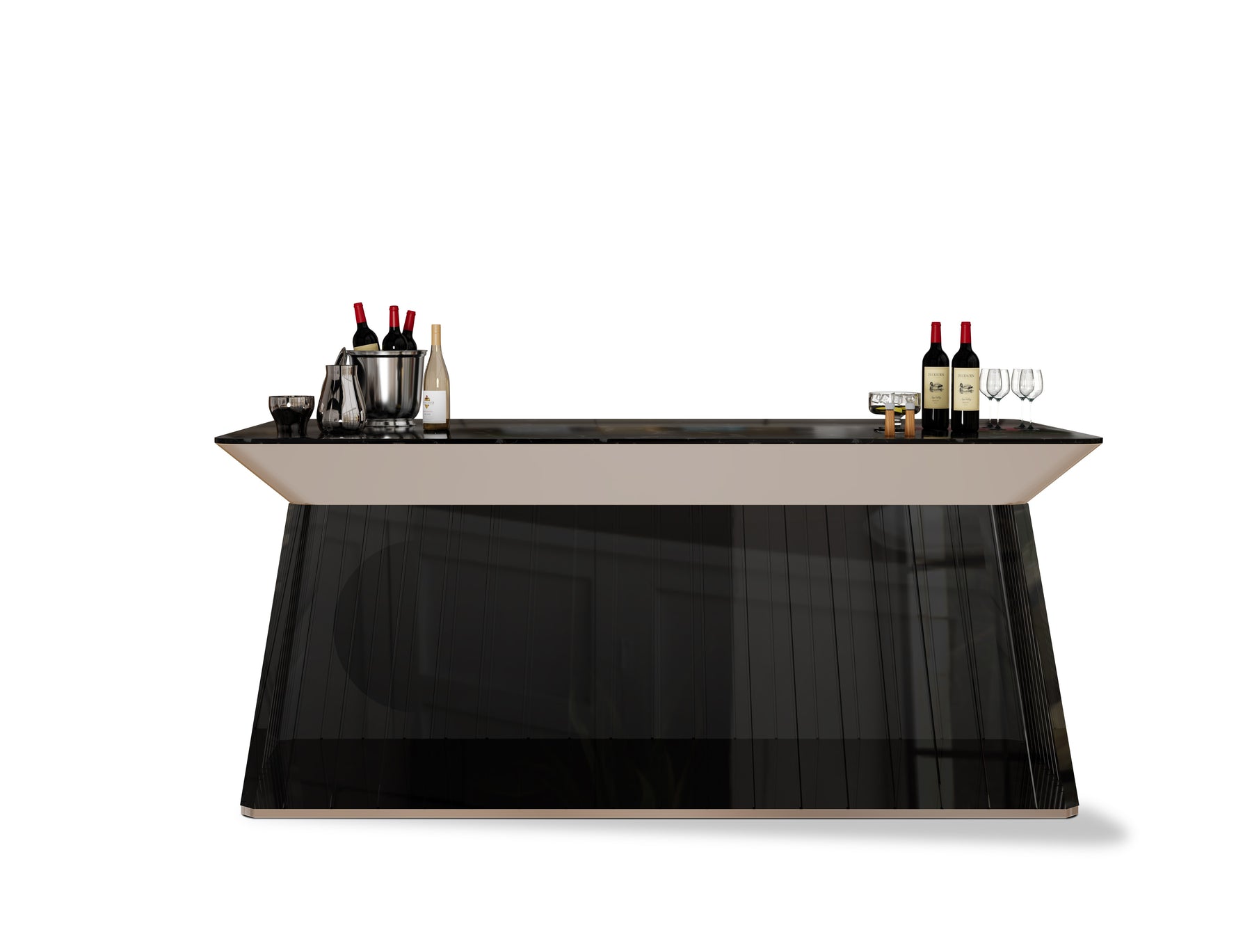 The Mirage Bar counter features a bold trapezoidal silhouette with a wide overhanging top, creating a striking architectural presence. Its clean lines and angular geometry give it a contemporary, sculptural appeal.The bold, modern shape enhances the sense of luxury, making every moment spent at the bar feel exceptional and enjoyable.